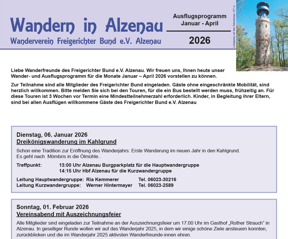 beim Wanderverein „Freigerichter Bund e.V. Alzenau“. Auf diesen Seiten wollen wir Ihnen jeweils aktuell Informationen geben – sowohl über unseren Verein und seine Aktivitäten ganz allgemein – aber auch ganz speziell über unser Ausflugs- und Tourenprogramm.