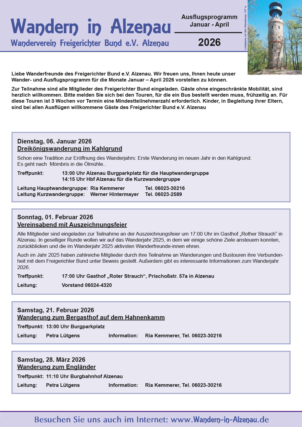 - Wir geben 3 mal jährlich ein gedrucktes Programm heraus, das die Ausflüge näher beschreibt. Es ist im Alzenauer Rathaus, in Geschäften, Banken und den Kindergärten erhältlich.